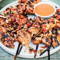 - Thread the chicken breast and thigh strips separately onto 30 to 40 bamboo skewers and transfer to a large rimmed baking sheet. Pour half of the marinade over the chicken, turning to coat completely. Refrigerate for 4 hours. Refrigerate the remaining half of the marinade in a serving bowl.